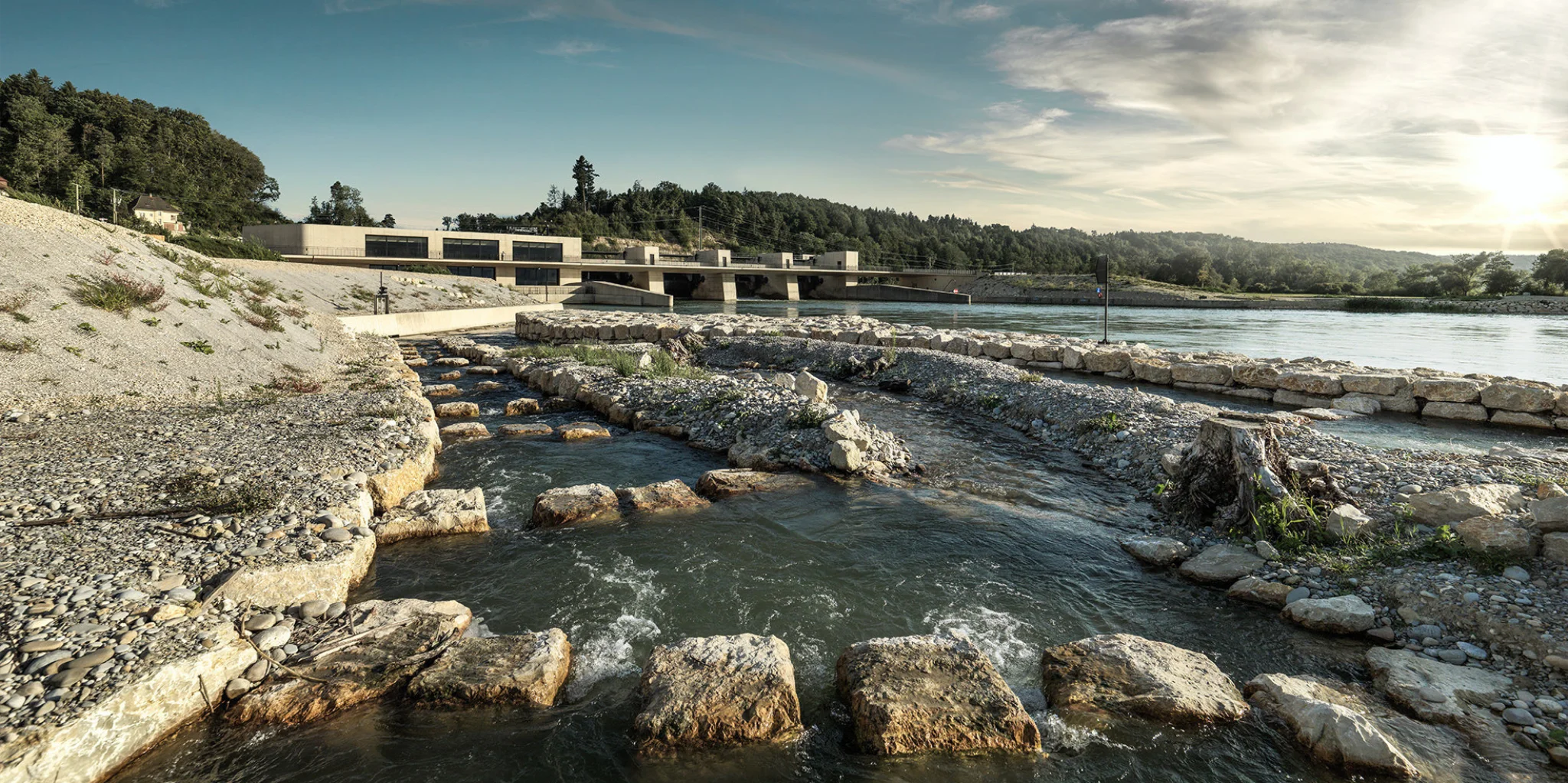 Energieinfrastrukturlandschaft am Aare-Hagneck-Kanal: Die Fischtreppe und zahlreiche weitere Anlagenteile zeugen davon, dass das Flusskraftwerk Hagneck landschaftsschonend und mit baukulturellem Anspruch saniert und ausgebaut wurde. © Michel Jaussi